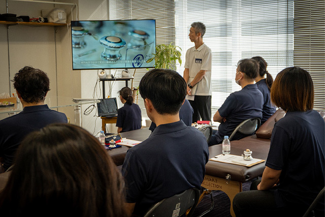 本格的な講習に入る前に、まずは自己紹介の時間が設けられました。12人の受講者の中にはご家族のケアを目的に参加した方もいて、「病気の夫の心身を少しでも癒してあげたい」という言葉から、深い愛情が伝わってきました。また「とにかく調子が悪い時期があって、試しにCS60を受けてみたら体がすごく軽くなったんです」と話す方も。ご自身の変化をきっかけに「自分の健康を守りたい」と研修に参加する人も多く見られました。